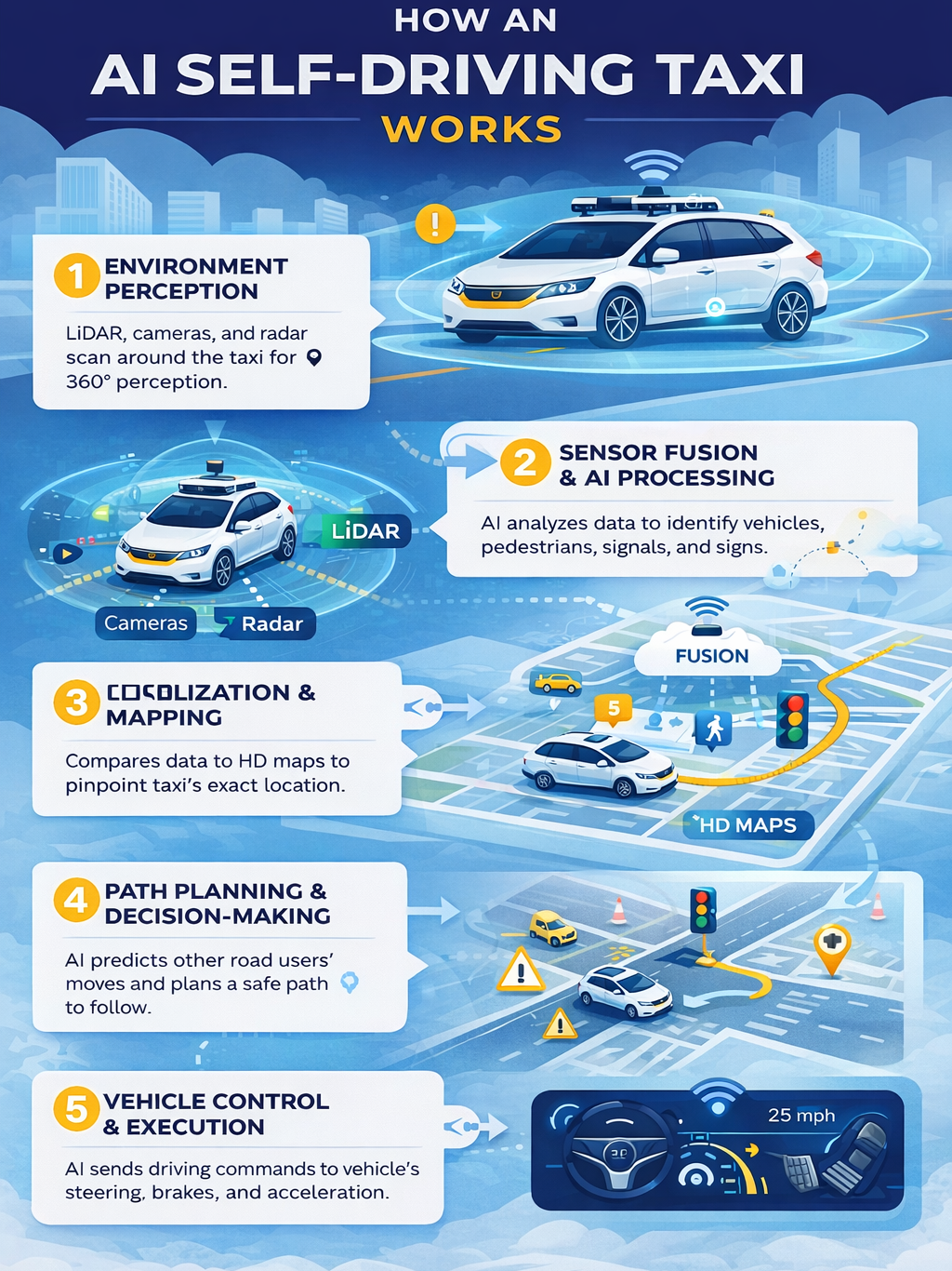 An AI self-driving taxi works by combining sensor perception, machine learning, real-time decision-making, and automated vehicle control into a single intelligent system. Hereâs how the process works step by step: